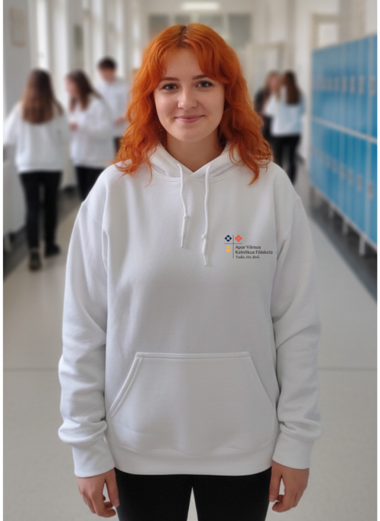 Apor Vilmos Katolikus Főiskola logózott Fehér kapucnis bebújós pulóver M méret